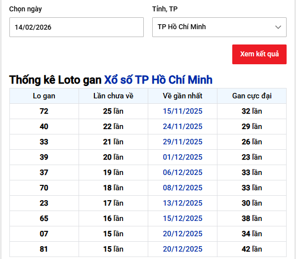 - Bảng thống kê lô gan Hồ Chí Minh lâu chưa ra tính đến ngày 16/2/2025