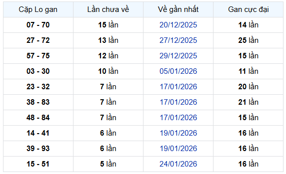 - Bảng thống kê lô gan Hồ Chí Minh lâu chưa ra tính đến ngày 23/2/2025