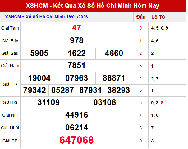 Từ thống kê XS Hồ Chí Minh đã phát hành, kết hợp soi cầu theo nhiều chu kỳ khác nhau, các nhóm số nổi bật bắt đầu xuất hiện rõ nét, mang đến cơ sở tham khảo đáng chú ý cho dự đoán xổ số Hồ Chí Minh 24 tháng 1 năm 2026.