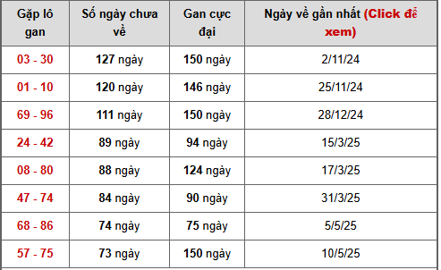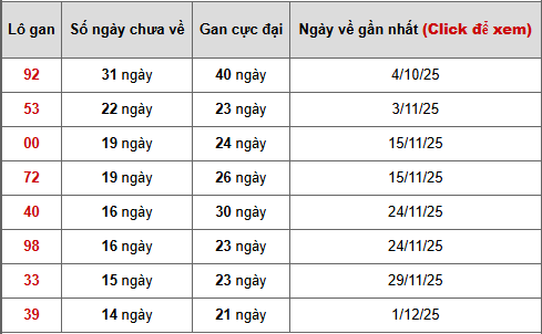 - Bảng thống kê lô gan Hồ Chí Minh lâu chưa ra tính đến ngày 24/1/2025