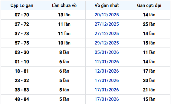 Dựa trên bảng cặp lô gan, có thể thấy nhiều cặp số đang tiến sát vùng gan nhạy cảm – thời điểm thường xuất hiện biến động và khả năng quay đầu khá cao, là dữ liệu đáng chú ý để dự đoán xổ số Hồ Chí Minh ngày mùng 7 tháng 2.