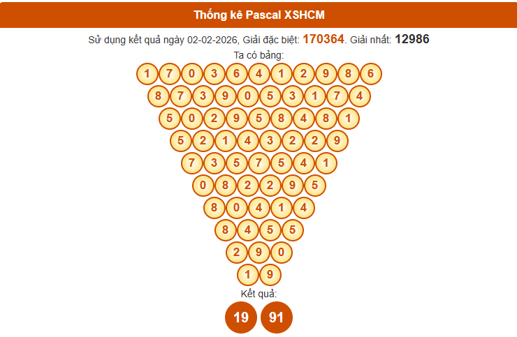 Phương pháp Pascal đang được nhiều người áp dụng nhờ tính linh hoạt khi soi cầu xổ số Hồ Chí Minh ngày 7/2/2026. Bảng Pascal mới nhất giúp sàng lọc nhanh các cặp số sáng, hỗ trợ theo dõi và nhận diện xu hướng hiệu quả.