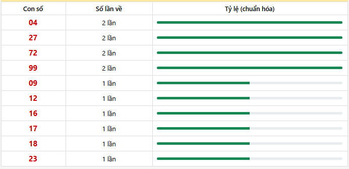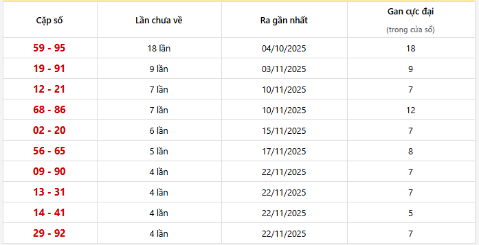 ⭐️ Cặp lô khan HCM ít về nhất: 59 - 95 (18 lần), 19 - 91 (9 lần), 12 - 21 (7 lần), 68 - 86 (7 lần), 02 - 20 (6 lần)