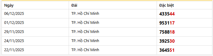 Thống kê giải đặc biệt tỉnh Hồ Chí Minh trong 5 kỳ quay gần nhất
