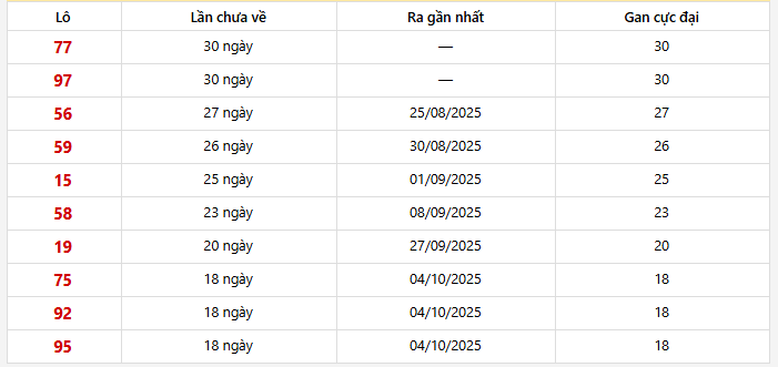⭐️ Những cặp số lô gan XSHCM lâu xuất hiện nhất: Lô gan 77 lâu ra nhất (30 ngày)