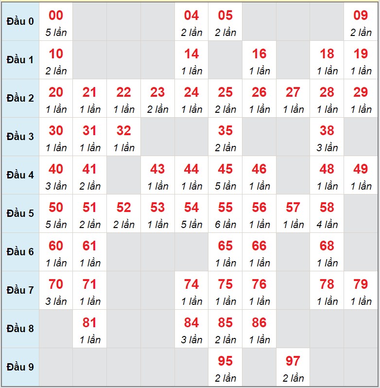 – Đầu số về nhiều: Đầu 7 ( 14 lần), Đầu 0 ( 61 lần), Đầu 3 ( 44 lần).