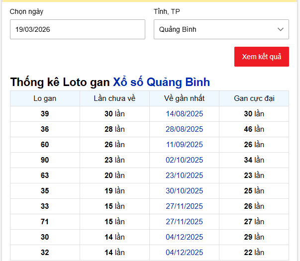 Dựa vào bảng thống kê Loto gan xổ số Quảng Bình, có thể thấy nhiều con số đang rơi vào chu kỳ gan dài và tiệm cận các mốc gan cực đại – dấu hiệu thường được người chơi soi cầu đặc biệt chú ý khi phân tích soi cầu xổ số Quảng Bình ngày 19 tháng 3 năm 2026.