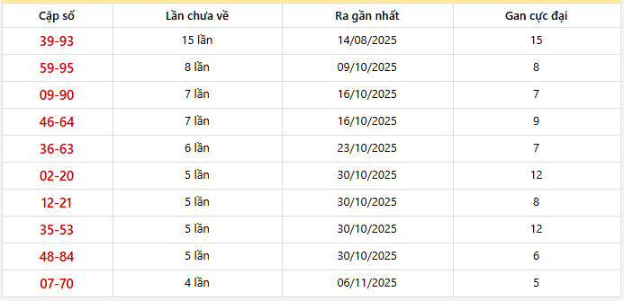 ⭐️ Cặp lô khan QB ít về nhất: 39-93 (15 lần), 59-95 (8 lần), 09-90 (7 lần), 46-64 (7 lần), 36-63 (6 lần)