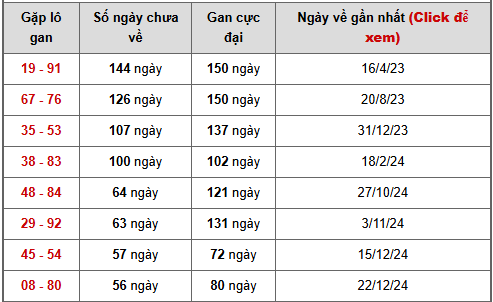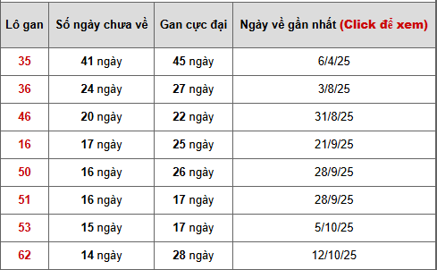 - Bảng thống kê lô gan Tiền Giang lâu chưa ra tính đến ngày 25/1/2025