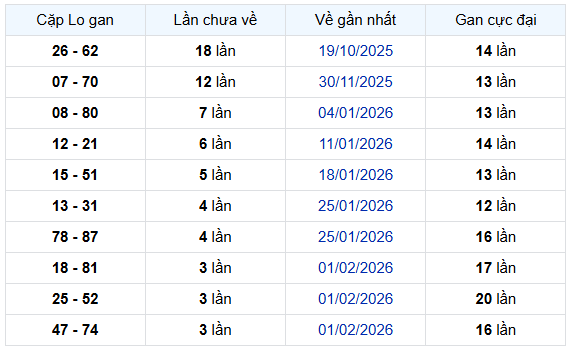 Nhìn vào bảng cặp lô gan, có thể thấy xuất hiện một điểm cực kỳ đáng chú ý: nhiều cặp đã vượt qua mốc gan cực đại trong lịch sử – dấu hiệu cho thấy khả năng “xả dồn” rất cao trong ngắn hạn. Đây cũng là dữ liệu quan trọng khi tham khảo dự đoán xổ số Tiền Giang ngày mùng 1 tháng 3 năm 2026.
