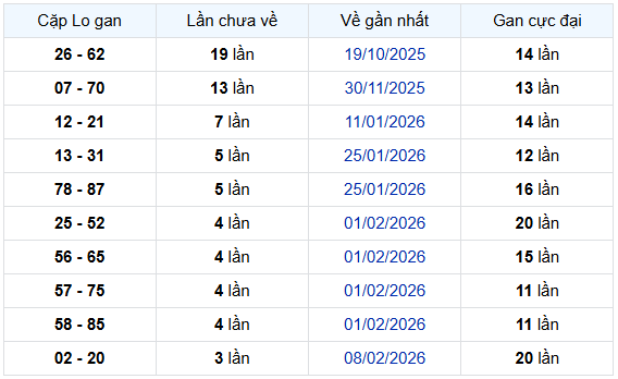 Dựa trên bảng thống kê cặp lô gan hiện tại, có thể thấy bức tranh đang khá “nóng” với một vài cặp số đã vượt ngưỡng gan cực đại – tín hiệu thường được giới soi cầu đặc biệt chú ý. Những dữ liệu này cũng là cơ sở được nhiều người tham khảo khi soi cầu XSTG ngày 8/3/2026 để tìm ra các cặp số đáng chú ý.