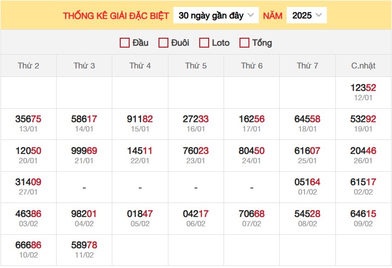 Thống kê đặc biệt Miền Bắc đã về trong 30 ngày gần đây